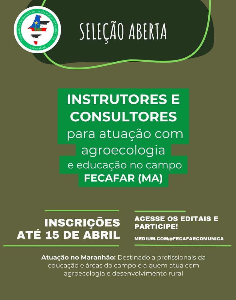 Estão abertas as inscrições para a seleção de instrutores e consultores que irão atuar no fortalecimento das Casas Familiares Rurais no Maranhão.